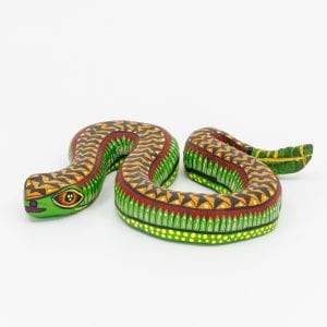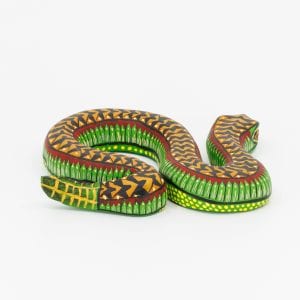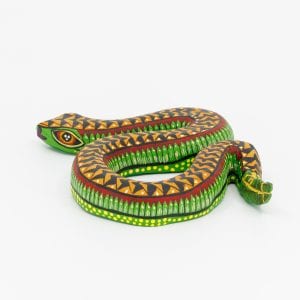 Ce serpent sculpté à la main dans le bois s’affiche fièrement, attitude décontractée et présence hypnotique. Le vert intense qui court le long du corps contraste avec des écailles orange ponctuées de détails jaune citron. La bordure rouge ajoute du caractère, tandis que la face et la queue regorgent de détails minutieux, signature de l’art populaire d’Oaxaca.